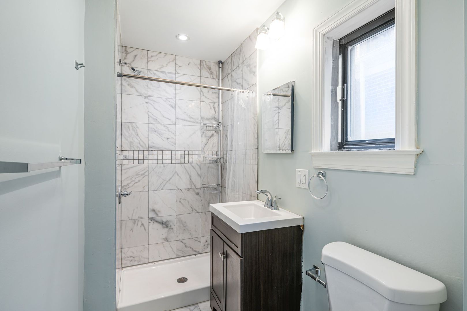 The bathroom is equally impressive with floor to ceiling marble tiles that give a spa-like feel. The bedroom is spacious and features plenty of closet space and additional storage, so you'll have plenty of room to store all your belongings.